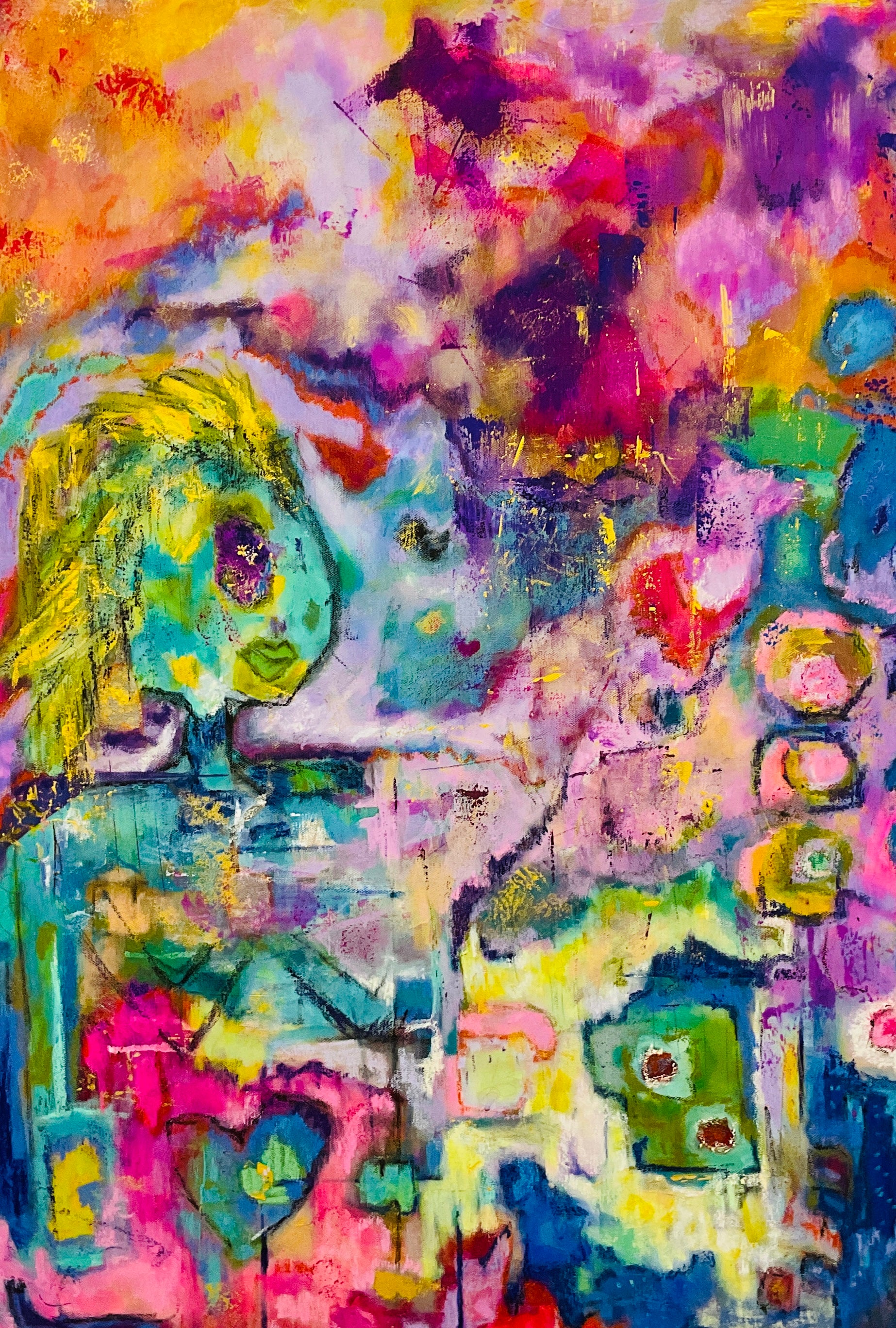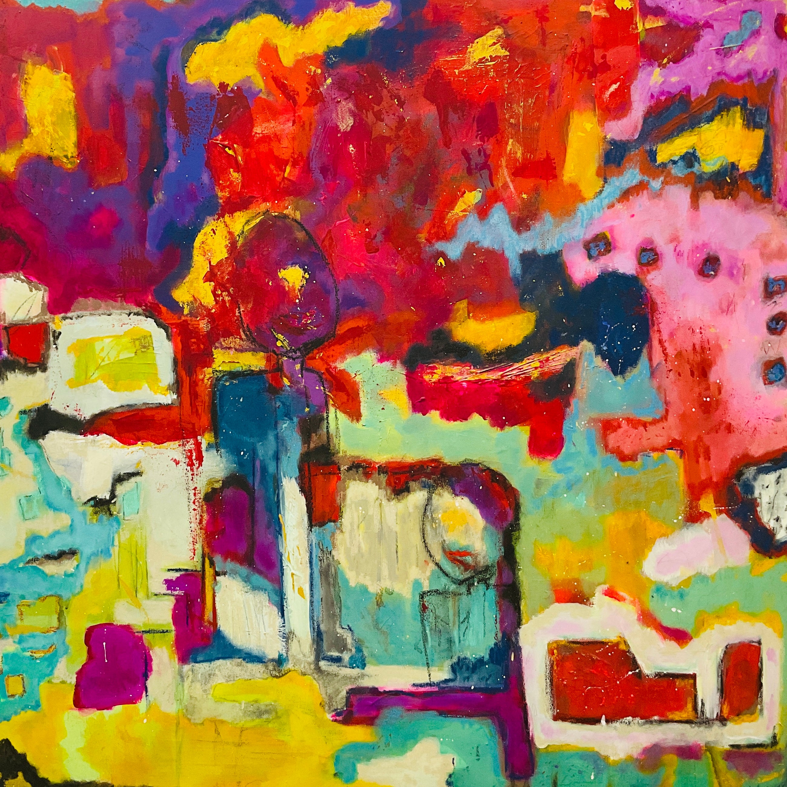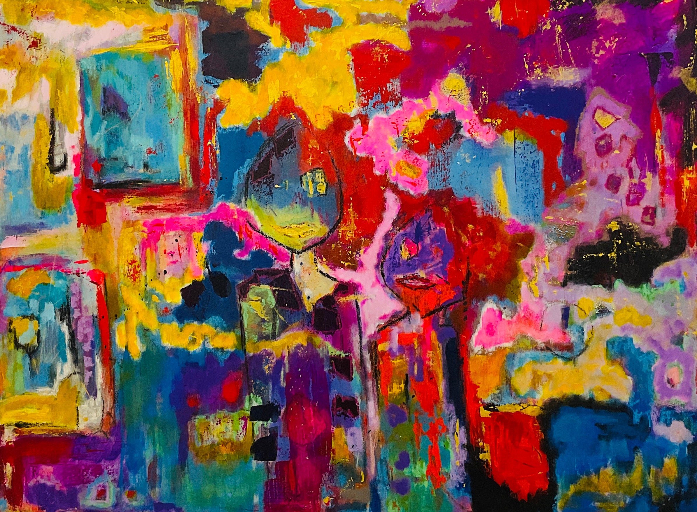 All my adult life I had a longing to paint. I began painting in 2019 and focused on fluid art. I was always practicing in the background with a brush and pallet knife, but fluid art was a way of creating that gave me confidence. I could blame the paint and the lack of control of the medium, not myself for the outcomes. As the pandemic set in, I felt a greater pull toward expression through direct marks and color. Bold bright color to awaken and create happiness. That’s when I began to take more ownership of the brush rather than letting the paint own me.