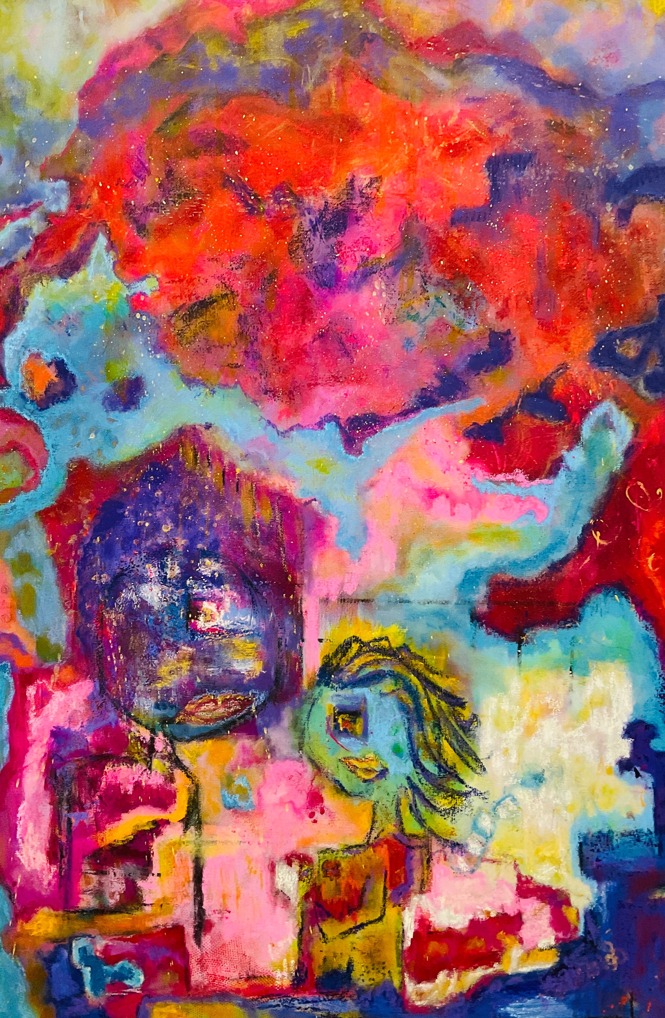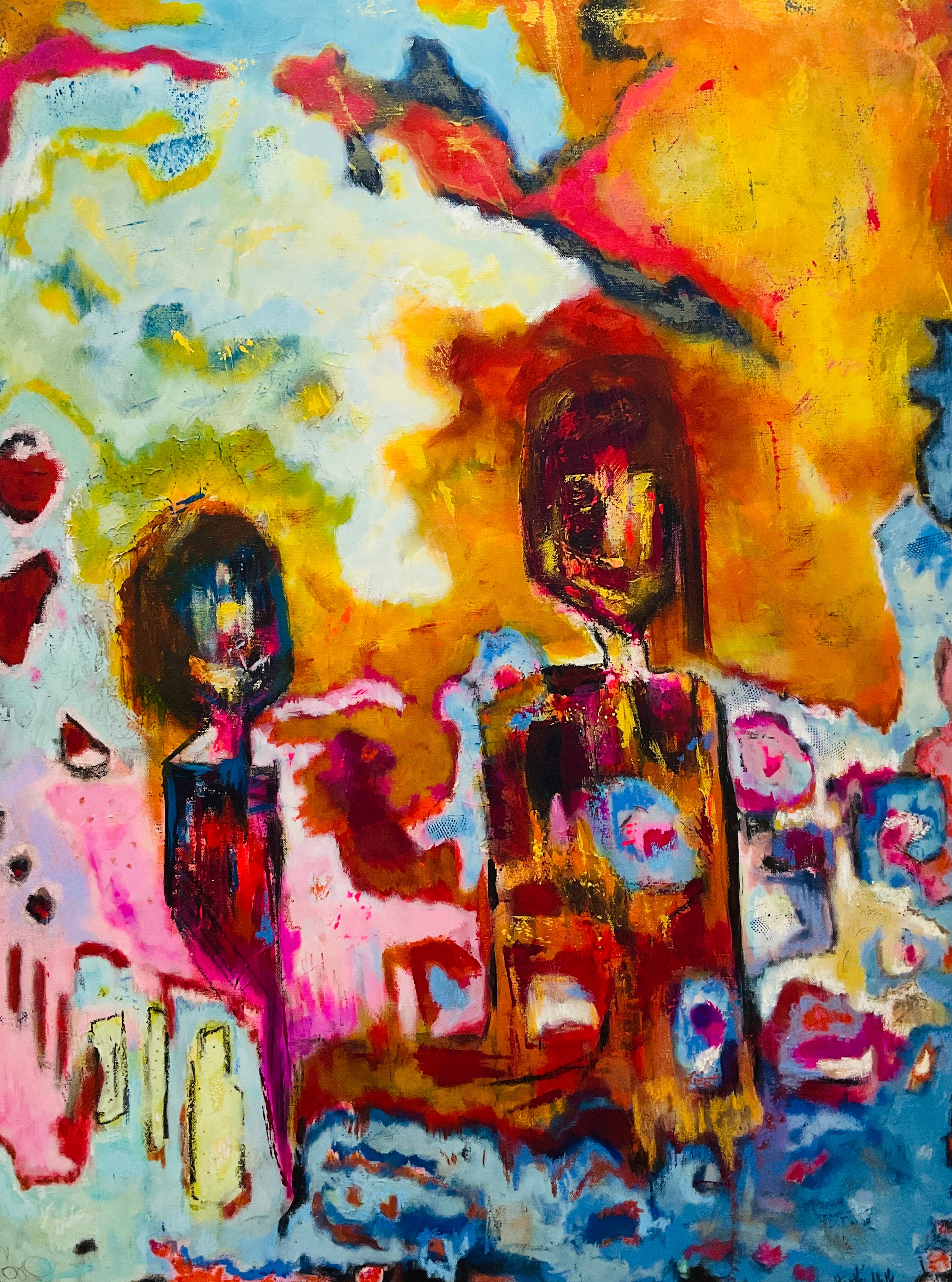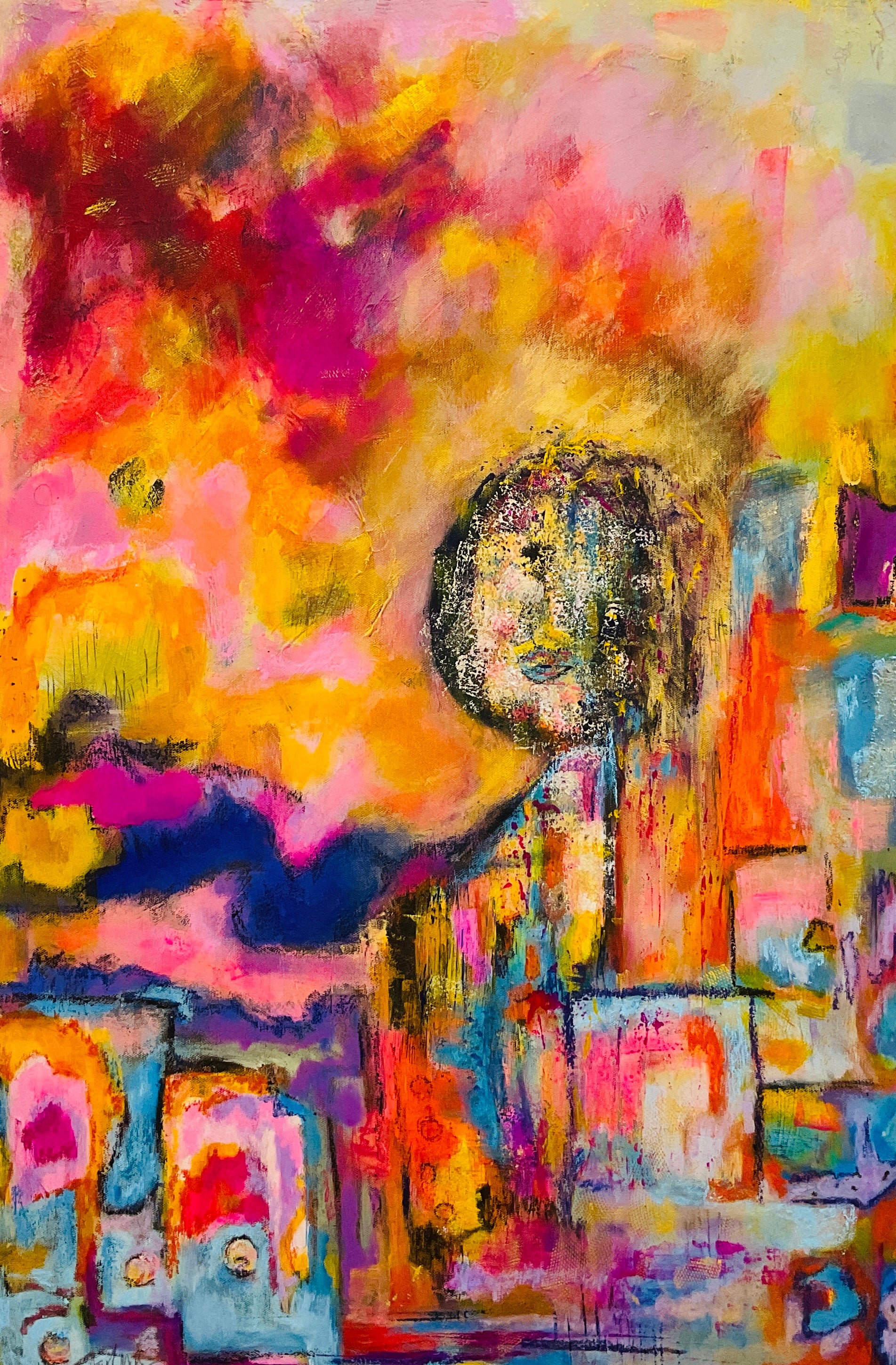All my adult life I had a longing to paint. I began painting in 2019 and focused on fluid art. I was always practicing in the background with a brush and pallet knife, but fluid art was a way of creating that gave me confidence. I could blame the paint and the lack of control of the medium, not myself for the outcomes. As the pandemic set in, I felt a greater pull toward expression through direct marks and color. Bold bright color to awaken and create happiness. That’s when I began to take more ownership of the brush rather than letting the paint own me.