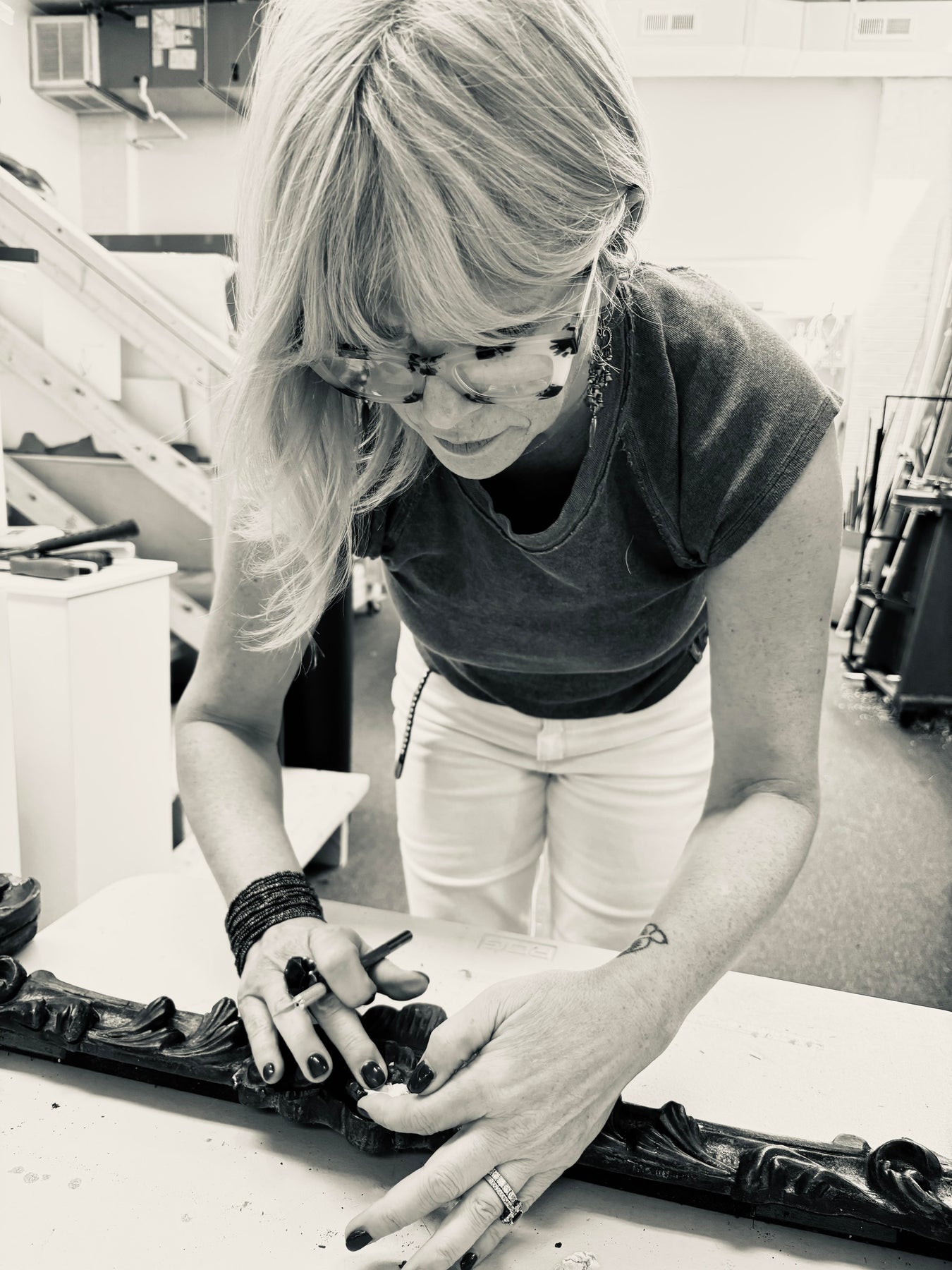 These gorgeous mirrors started with these antique, ornate gold frames. Restored in house and revamped with a modern twist with the addition of crisp white lacquered wood, a beveled mirror and gold fillet.