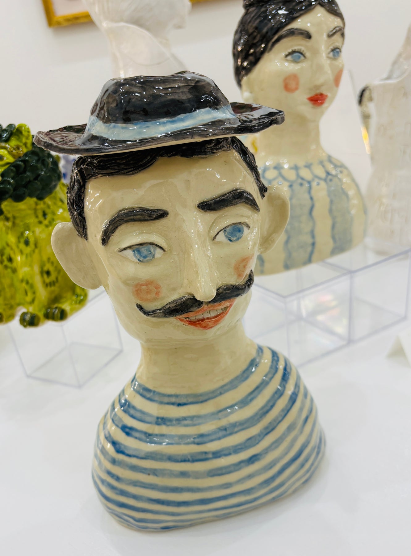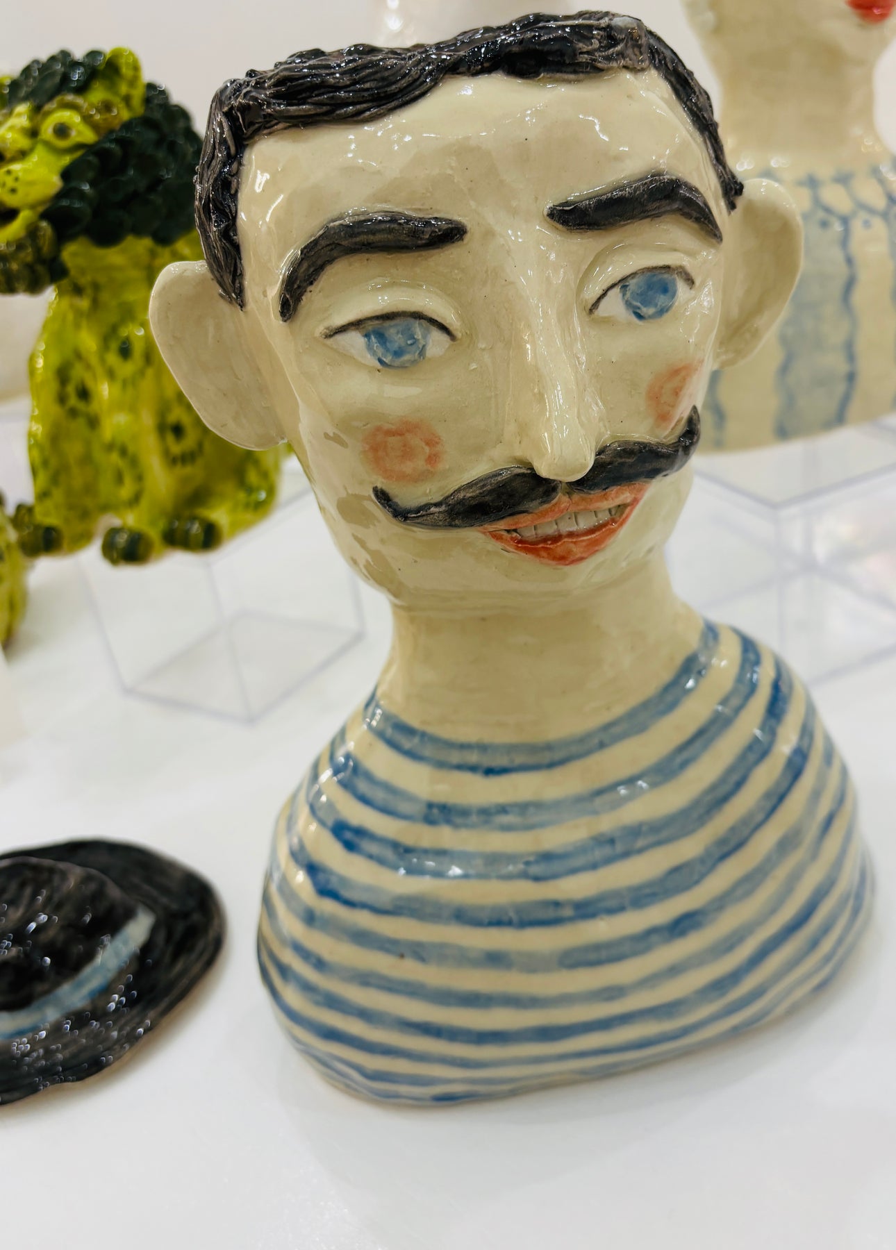 This whimsical vase was hand sculpted of clay and the hat is removable.